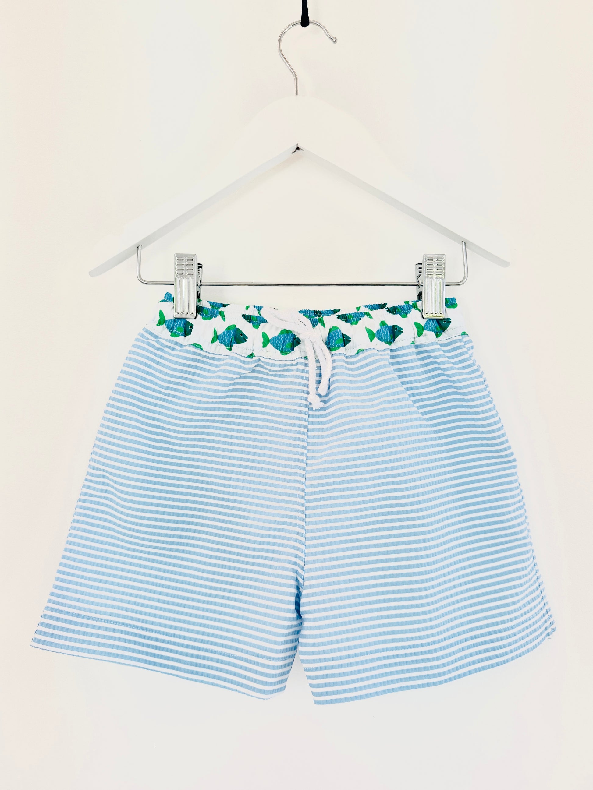 Make a splash in style with these boys' swim shorts, crafted from breathable seersucker cotton for all-day comfort.