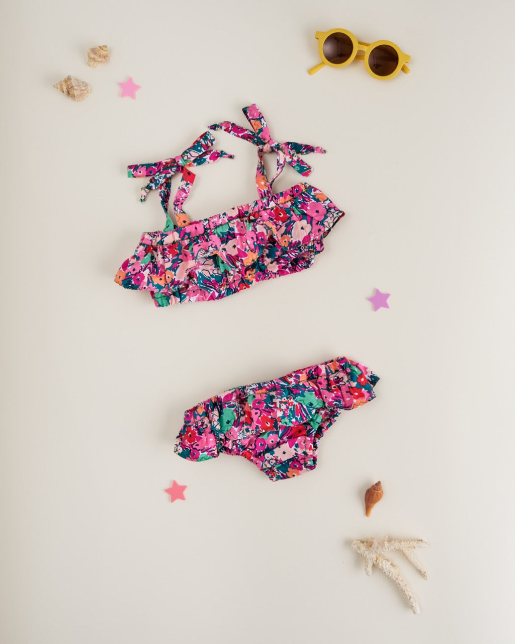 The first bikini of your little girl can still be soft on her skin and glamorous like no other. Adorned with frills and ruffles, this iconic bikini model is inspired by the Amalfi Coast fashion. It features adjustable shoulder straps to adapt to her growing body.